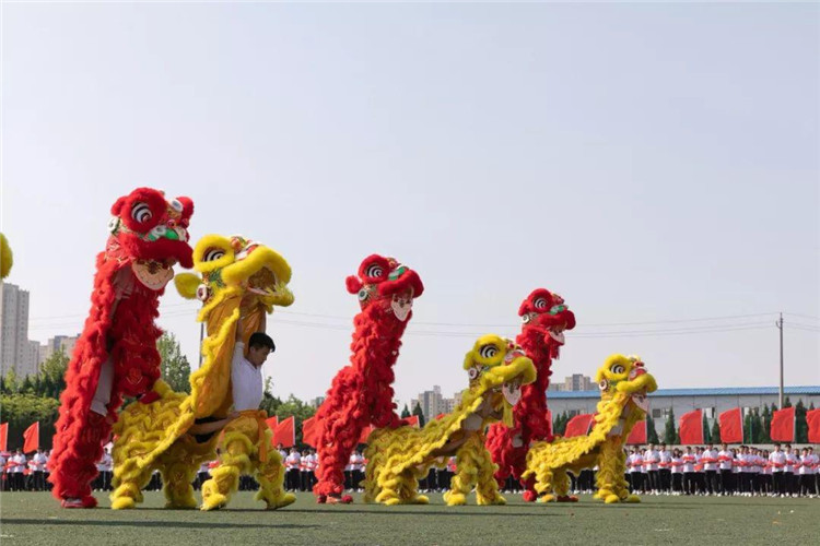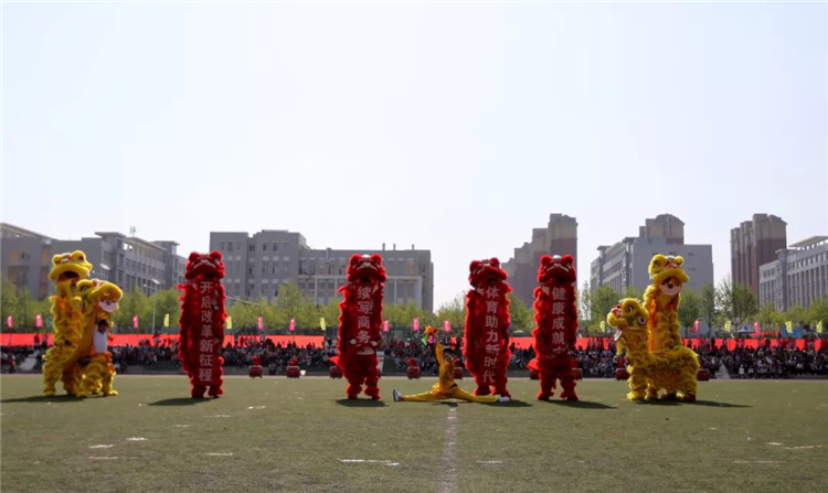 团体操表演以狮子舞开场,再现了我们商务人不屈不挠、奔腾争跃、喜气祥和的精神面貌。由信息艺术系、机电工程系、食品工程系三个系共800名同学带来的团体操表演动作整齐划一,节奏感强烈,让人眼前一亮:800名同学沐浴明媚的春光,迎着欢快的音乐,他们手持火红的扇子,奔向操场的中央,翻飞舞动的扇子抒发着生命的喜悦,舒展大方的动作洋溢着生命的欢快。运动场上,他们组成的九道方阵,恰似彩色的海洋,一个个充满青春活力的青年挥动着彩扇,熠熠生辉。表演队伍变成了大花园的图案,寓意“渊源共生,和谐共融”,预示着我们学校更加辉煌!圆中圆,大同心圆,围绕不变的中心点,串成九个同心圆,是希望、拼搏、勇气、守望,把我们的奋力拼搏的心串联在一起,串成梦想之圆。随后,表演队伍变换出“十九大”以及“S””W”的图案,寓意我们山东商务职业学院在党的十九大的光辉指引下,在学校党委的正确领导下,一定会魅力四射,奏响高职院校最强音!