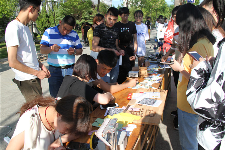 师生簇拥在“鲁班文创工作室”的摊位前,仔细观摩专业设备,详细询问设备功能,有的同学则饶有兴趣的亲手用激光雕刻机、刻刀和牙机制作书签。“我平时就喜欢收藏书签,也自己用树叶做过书签,今天有机会能用专业设备亲手雕刻一个书签感到非常兴奋,书签上有我的名字,这是我的专属书签。”17级旅管专业的刘晓宇同学激动地表示,会把书签珍藏留作纪念。