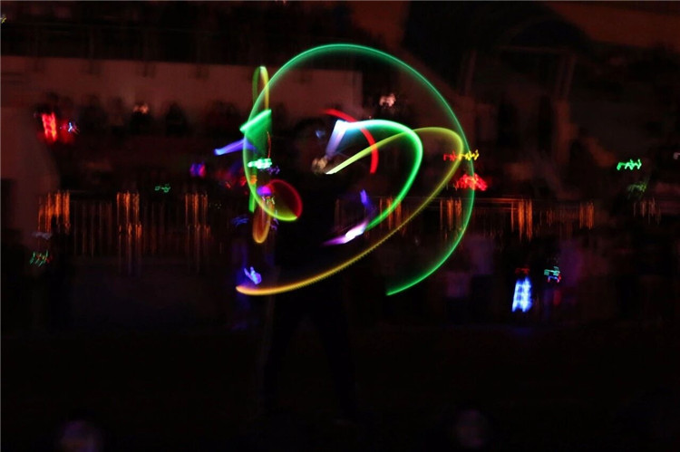 本站讯 夏日夜幕下的静谧校园,被移动着的炫彩荧光和欢声笑语嗨翻。一群快乐的青春精灵,身上佩戴闪闪发光的手链、发箍、发卡、戒指,奔跑在周末的校园内,炫丽荧光点亮美丽校园。