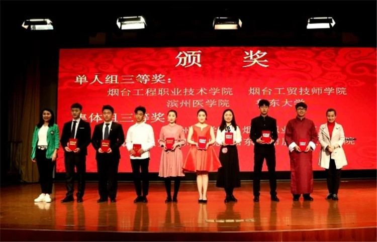 经过选手们精彩的比拼,揭晓了个人组和多人组多个奖项。个人组单元,一等奖山东商务职业学院《我的爸爸》;二等奖山东工商学院《又见总理含泪的双眼》、二等奖烟台职业学院《我爱你 我的家乡 我的祖国》、二等奖山东省城市服务技师学院《美丽中国》;三等奖烟台工贸技师学院《满江红 怒发冲冠》、三等奖烟台工程职业技术学院《祖国,您好!》、三等奖滨州医学院《我的南方和北方》、三等奖鲁东大学《让五四精神薪火相传 为民族复兴奉献青春》。多人组单元,一等奖烟台大学《驼峰之魂》;二等奖山东工商学院《驼峰之魂》、二等奖山东商务职业学院《穿越时空的对话》、二等奖烟台工程职业技术学院《生命点波》;三等奖滨州医学院《我的祖国》、三等奖烟台工贸技师学院《青春中国》、三等奖烟台职业学院《感动烟台的爱》、三等奖山东省城市服务技师学院《祖国是我,我是祖国》。
