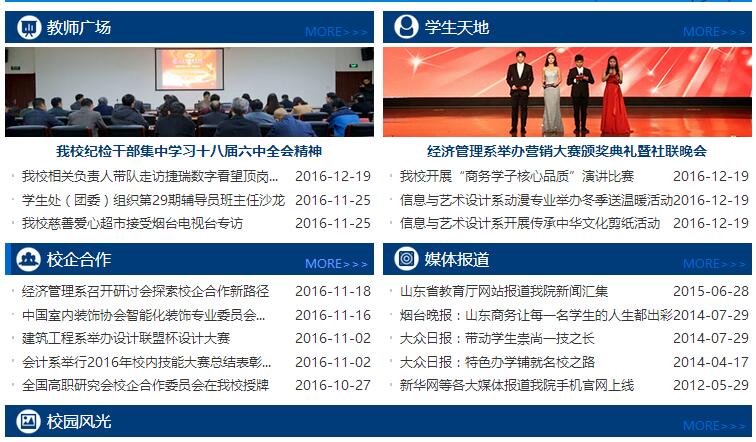 板块设置上,网站打破原有布局,新增轮播大图主题板块、教师广场、学生天地、校企合作、就业创业、校园风光等板块,提高了观赏性、可读性和实用性。