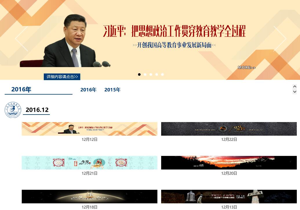 轮播大图主题板块位于网站顶端,采用“事件日历式”图片轮播设计,选取或整合现下时事新闻事件、校园风光、节气节点等内容,形成的“事件式日历模式”丰富网站的内容,增加网站人文色彩。今后,轮播大图主题板块将做到高效快捷的更新频率,增加网站的动态感受与视觉冲击。