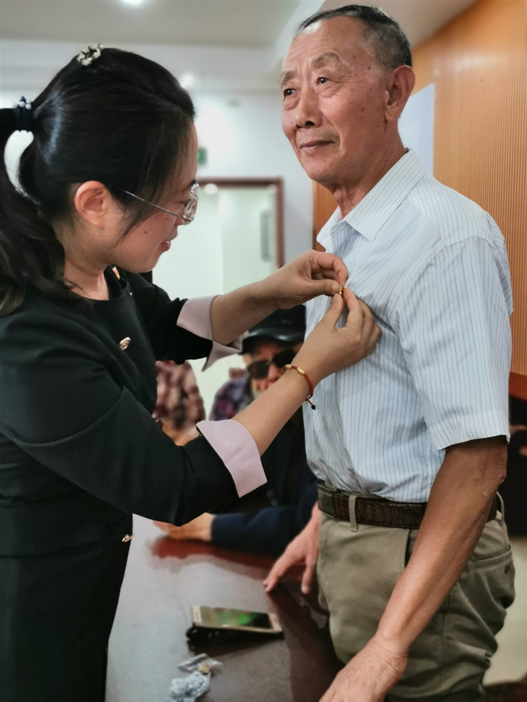 年轻党员为老党员佩戴党徽