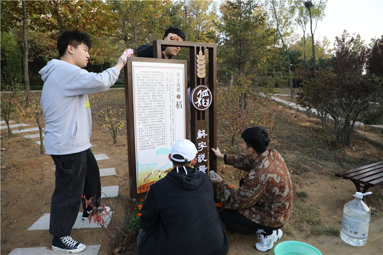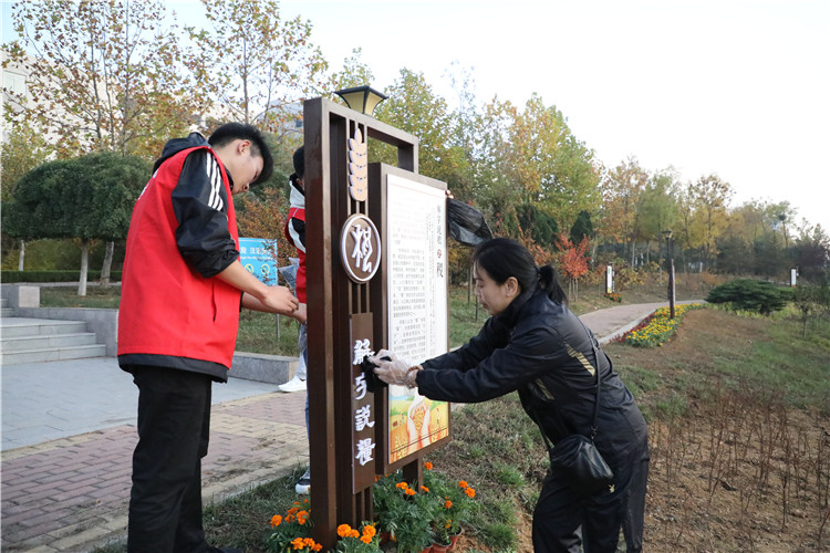 10月22日下午,支部全体党员自备水桶、水盆、抹布、扫帚等工具,带领“红色引领、结对帮扶”班级——建筑工程系2018级市政班同学,开展清洁青年湖环境卫生活动。师生们仔细擦拭“解字说粮”宣传栏、路边标识牌、警示牌、路灯灯柱,清洗“阳光”雕塑台,清理花坛路边杂草、捡拾草丛中的垃圾,党员们边劳动边与同学们交谈,为大赛做贡献的喜悦洋溢在心间眉梢,喜迎大赛的饱满热情体现在点滴行动中。