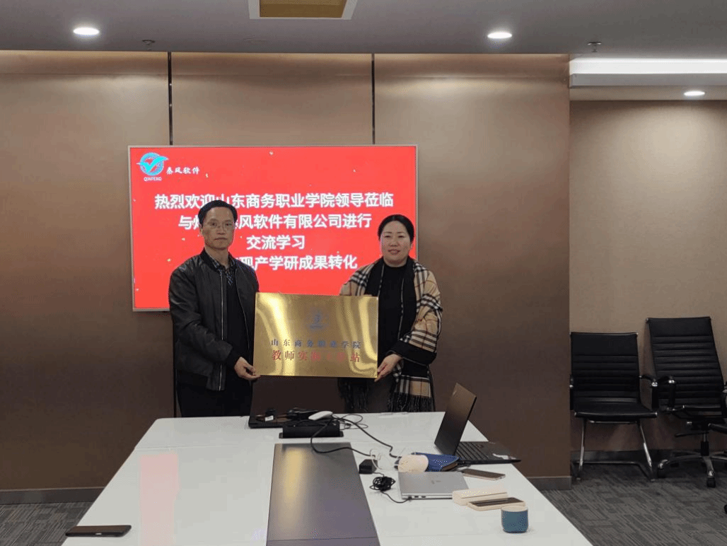 座谈结束后,王九福向烟台秦风软件有限公司授予了山东商务职业学院教师实践工作站牌匾,标志着校企合作的进一步深入。