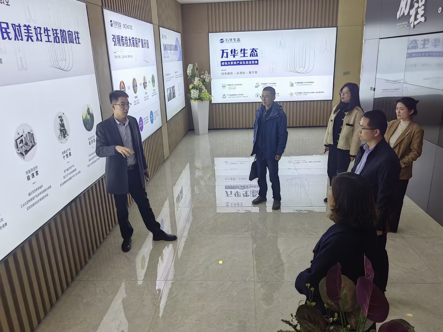 在实地考察企业核心产品及引领性家装创新方案时,孙长冲向校方展示了企业产品的核心优势。依托万华集团自主研发的聚氨酯无醛胶核心技术,公司产品实现从基材到成品的全链条环保升级,已通过国家绿色建材认证;其模块化装配式装修体系可适应旧城改造、精装房升级等多样化场景,目前已在山东省内多个城市更新项目中实现规模化应用。班翊特别指出,在存量房改造与城市更新背景下,装配式装修技术可大幅提升施工效率、降低资源消耗,其自主研发的模块化产品体系已形成独特竞争优势。随着装配式装修产业集群建设加速,亟需产品研发、智能生产、工程交付等大量具备工业化思维的新型人才,这与校方正在筹备的装配化装修技术新专业方向高度契合。
