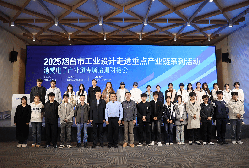 本站讯 10月11日,烟台市工业设计走进重点产业链系列活动——消费电子产业链专场培训对接会在高新区烟台国际设计小镇召开。艺术设计学院受邀参会,学院党总支书记赵永刚、副书记王海涛、副院长于洋带队,学院校企合作办公室负责老师及2025级30名学生参加会议。